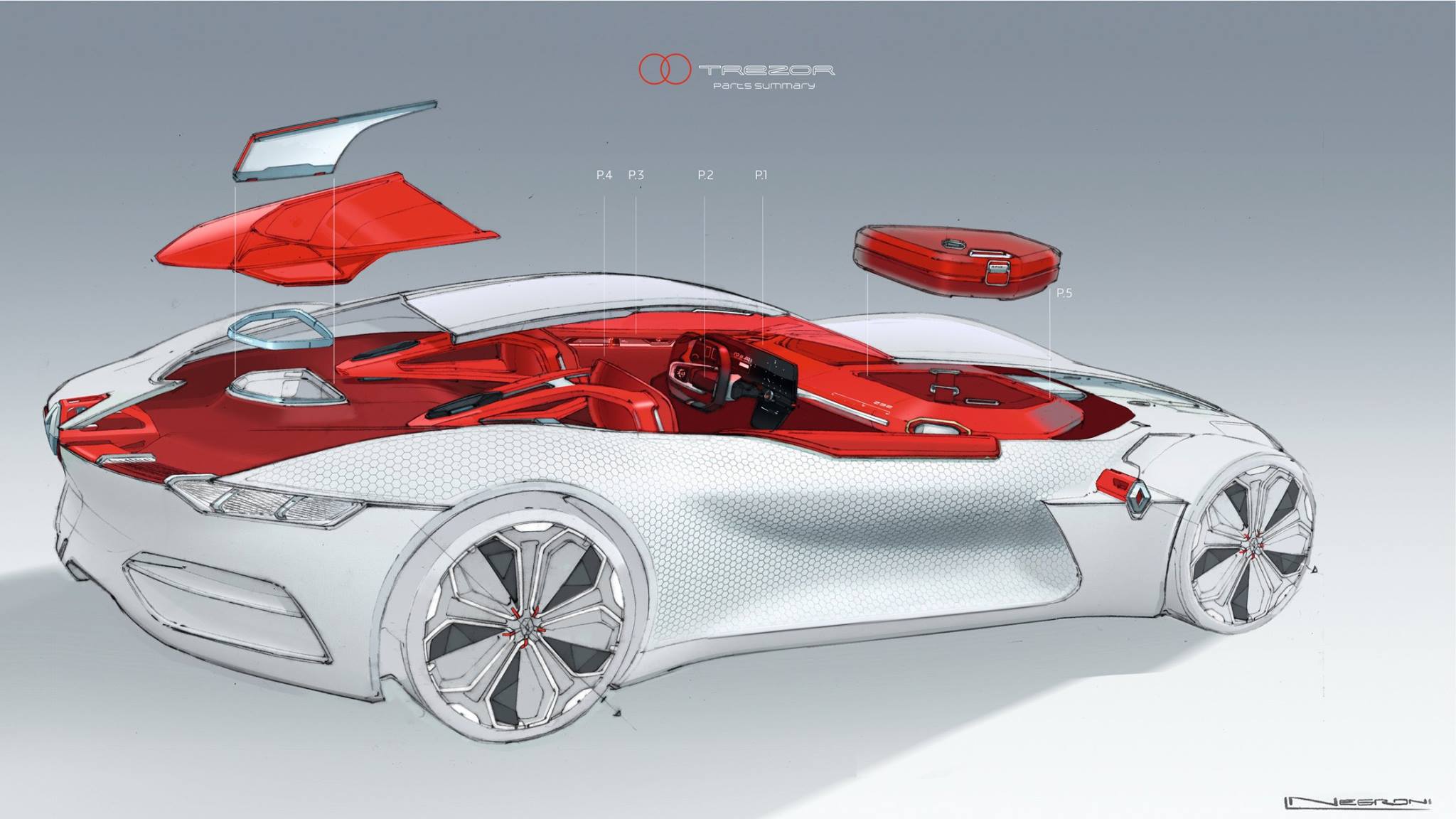 Signé Stéphane Janin et Yann Jarsalle pour le style extérieur, la Renault TreZor n’est pas sans rappeler, avec sa robe grise, les nouvelles « Flêches d’Argent » Mercedes-Benz au design résolument streamline, hyper aérodynamique et très épuré, on pense ici aux sublimes Vision GT et Concept IAA.
