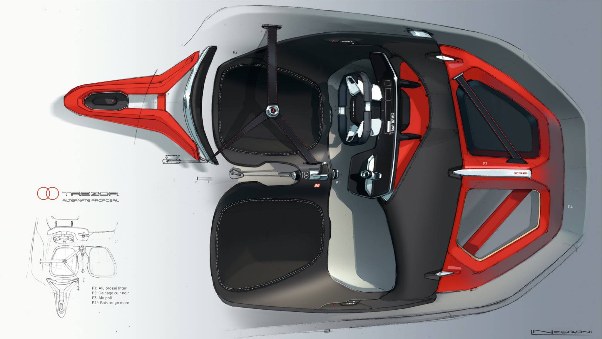 Bois massif, velours épais amarante pour les surfaces de sol, cuir Nappa rouge pour les assises, l’intérieur de la TreZor est un cœur qui s’emballe !