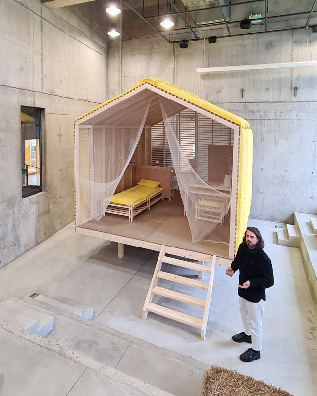 Direction Firminy pour retrouver Studio Doppel ! Le duo a effectivement investi le Site Le Corbusier en se posant la question de l’espace minimal, comme l’avait fait en son temps Le Corbusier avec son fameux cabanon de Roquebrune Cap-Martin. Ici, l’environnement de départ est le champ céréalier. S’en suive la conception de _ prototypes qui vont du mobilier à la micro-architecture, avec en tête l’idée de réutiliser les bâches agricoles jaunes, les savoir-faire des charpentiers, et les réfléxions du duo sur les bifurcaitons en cours et à venir. Une exposition passionnante, dans un lieu fabuleux !