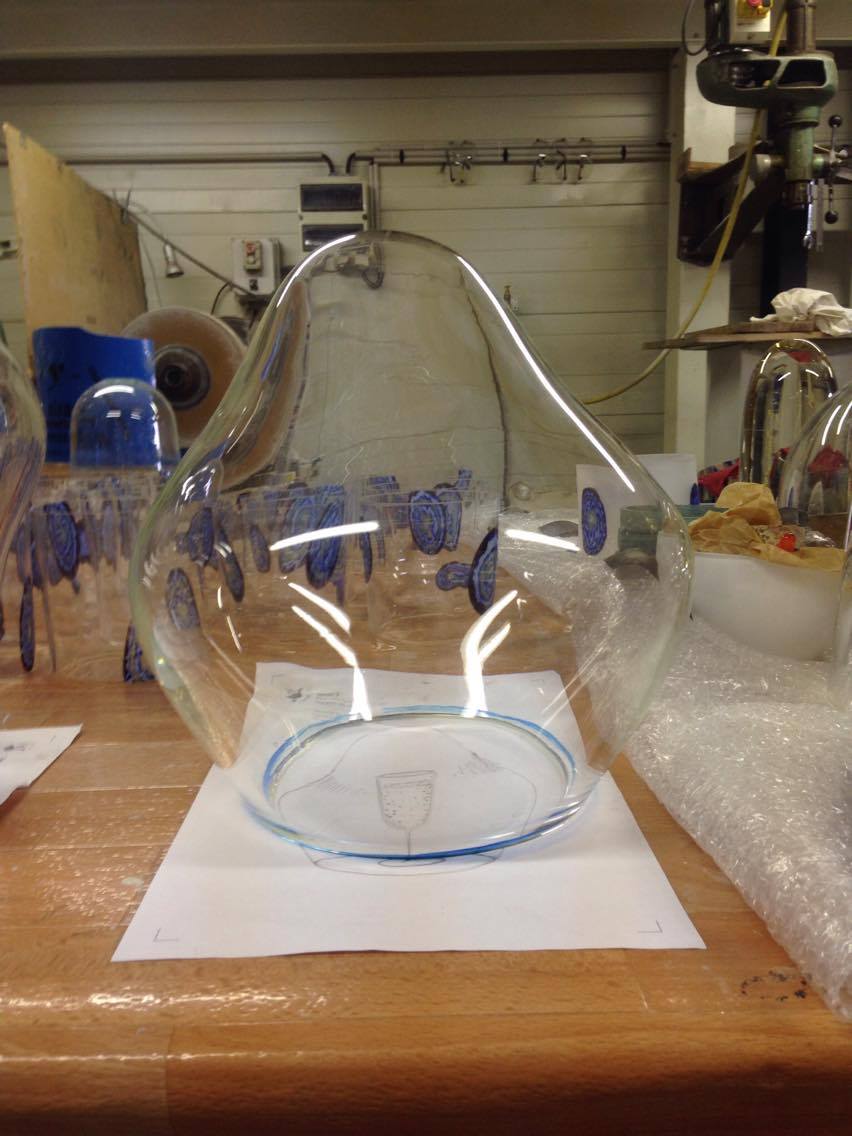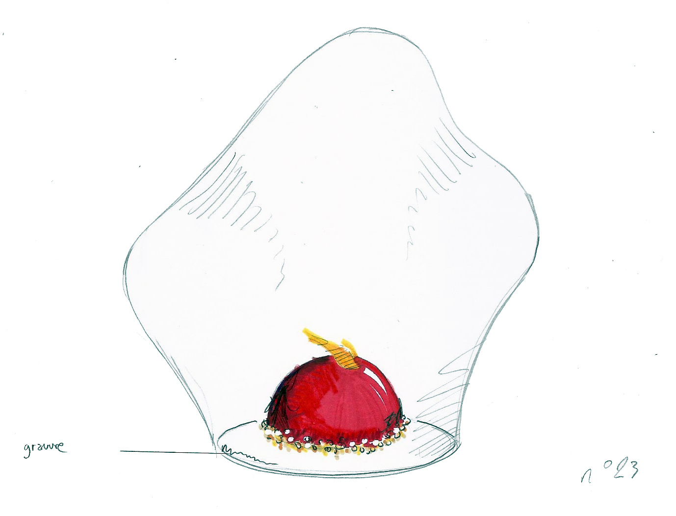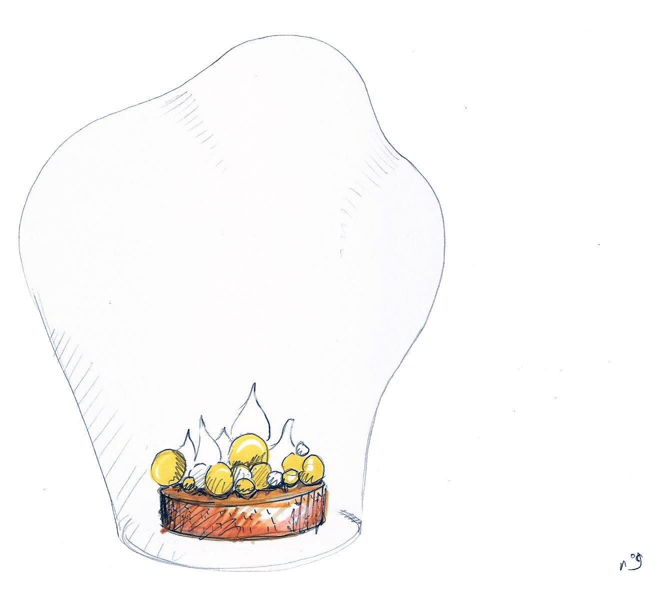 Les formes aléatoires en verre soufflées bouche baptisés steam sur des stèles , des piedestals , des socles c’est du Lehanneur light ….Quand aux toques dans l’espace, elle prennent la place des contre poids des suspensions lumineuses à winch qui est l’analogie formelle,fonctionnelle,conceptuelle des cloches réfrigérée s des pâtisserie des rêves